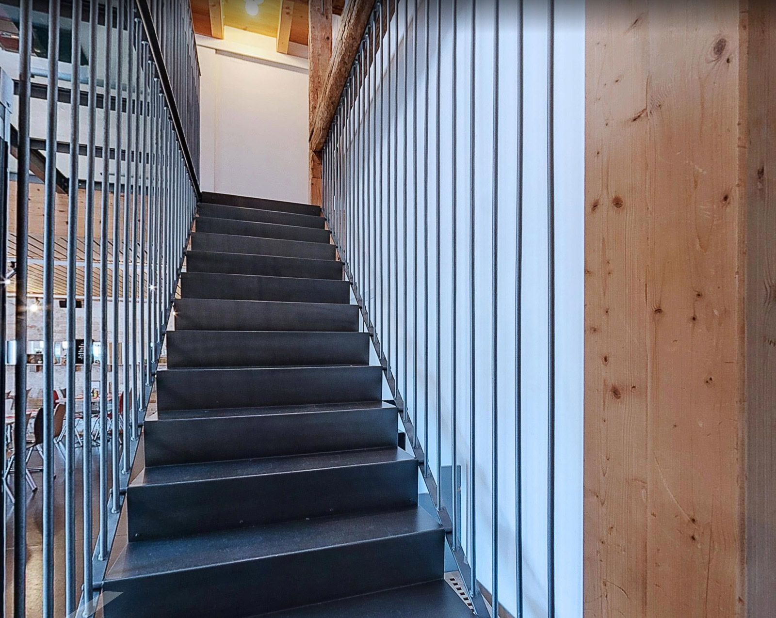 Um die Geräusche so vieler Menschen in einem relativ offenen Raum zu dämpfen, haben wir ein Schalldämpfungssystem entwickelt, das sich unbemerkt einfügt. Die Holzlatten stehen in einem gewissen Abstand zueinander, dahinter befinden sich weiche Holzfaserplatten.